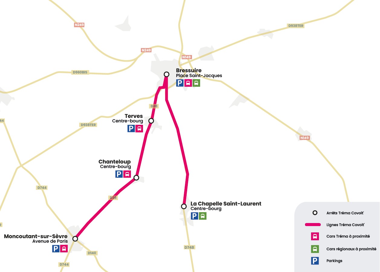 Courant novembre 2025, 2 lignes de covoiturage dynamique seront lancées en Bocage Bressuirais : Bressuire/La Chapelle Saint-Laurent et Bressuire/Moncoutant-sur-Sèvre en passant par Terves et Chanteloup. Et l’année prochaine, une 3ème ligne Bressuire/Nueil-Les-Aubiers sera mise en place.